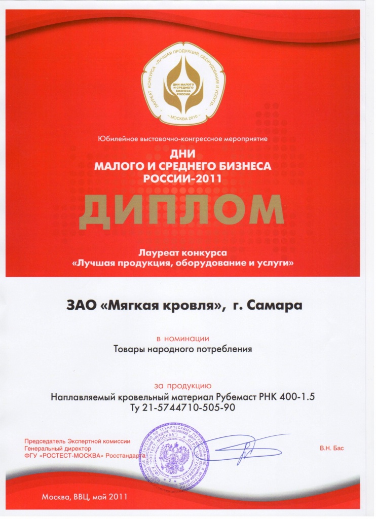 В торжественной обстановке Е.В. Шахматов вручил дипломы от ФГУ «РОСТЕСТ-МОСКВА» Росстандарта ЗАО «Мягкая кровля», которые стали лауреатами конкурсов «Лучшая продукция, оборудование и услуги» в номинации «Товары народного потребления» (за наплавляемый кровельный материал «Рубемаст») и «Лучший инновационный проект» (за технологию энергосбережения в строительстве с использованием несъемной опалубки третьего поколения).