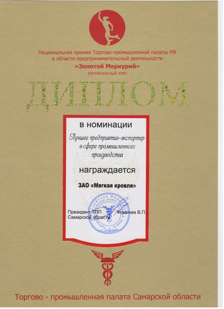 В этот же день состоялось вручение национальной премии Торгово-промышленной палаты РФ в области предпринимательской деятельности «Золотой Меркурий 2011». ЗАО «Мягкая кровля» победило в номинации «Лучшее предприятие-экспортер в сфере промышленного производства».
