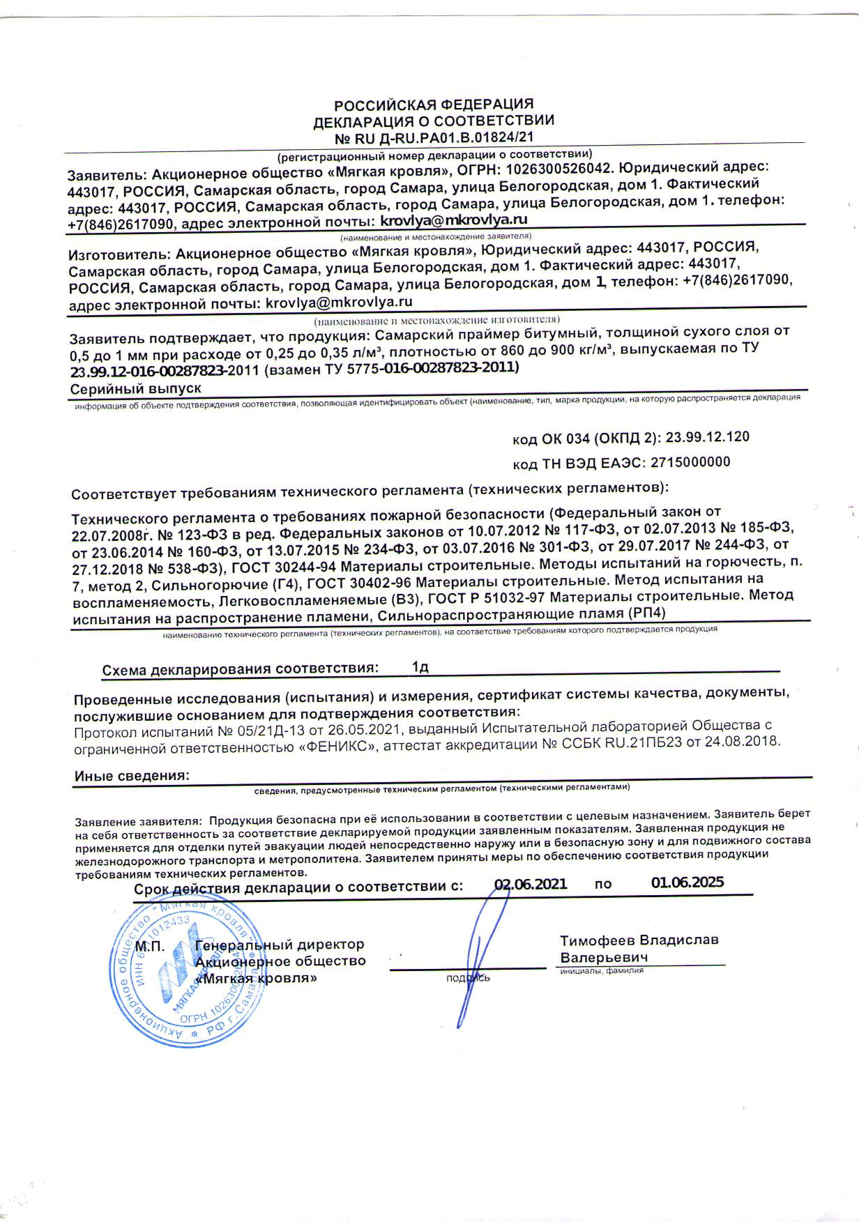 Самарский праймер битумный. Декларация о соответствии